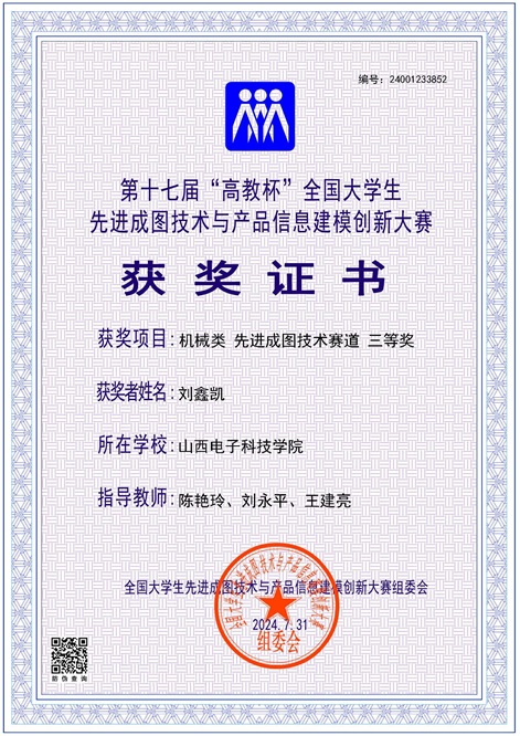 7月26日-29日,第十七届“高教杯”全国大学生先进成图技术与产品信息建模创新大赛全国总决赛在贵州大学举行,大赛吸引了来自全国895所高校的近40万名选手参赛,共12694名学生进入决赛。由于大赛人数较多,各省设立分赛场。山西分赛场在太原理工大学举行,我校机械电子工程专业2023级学生刘鑫凯获得了个人三等奖的成绩。