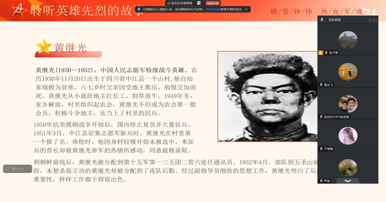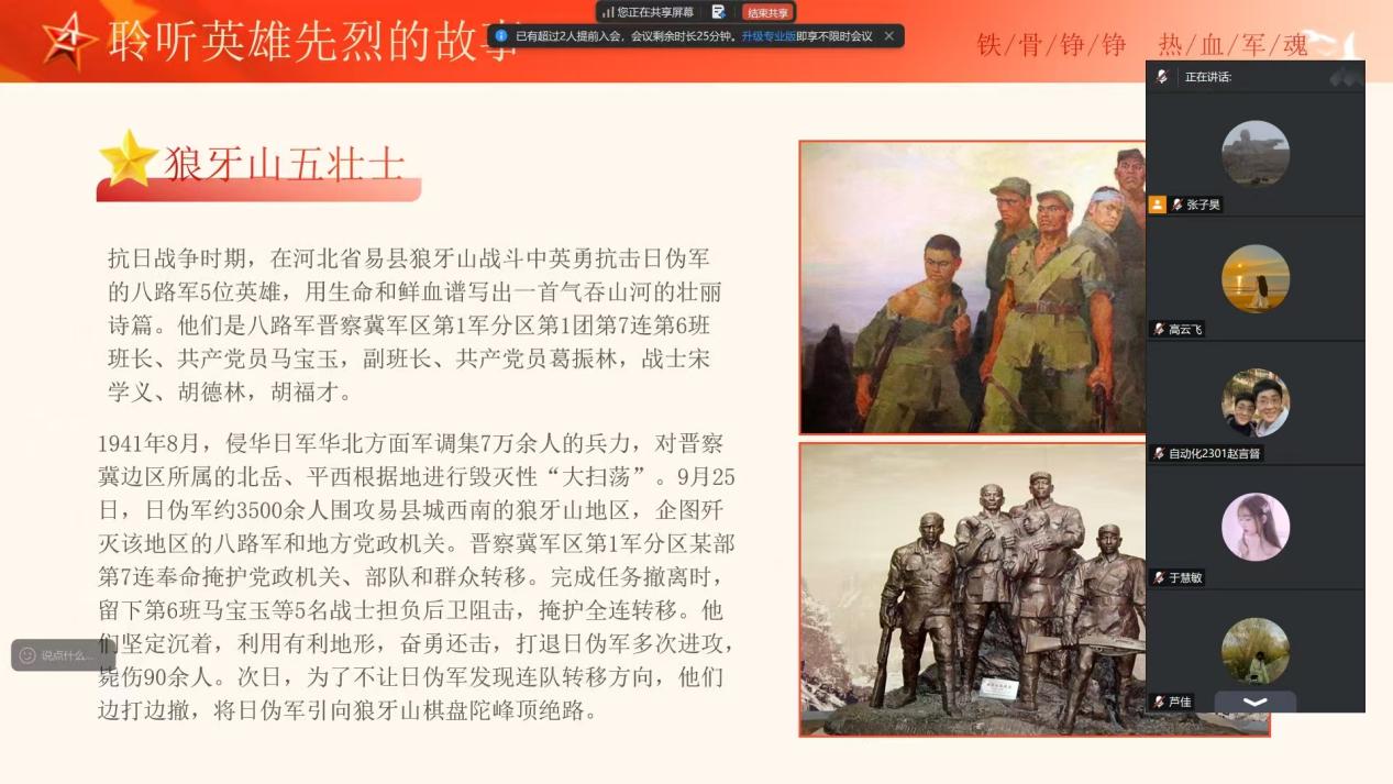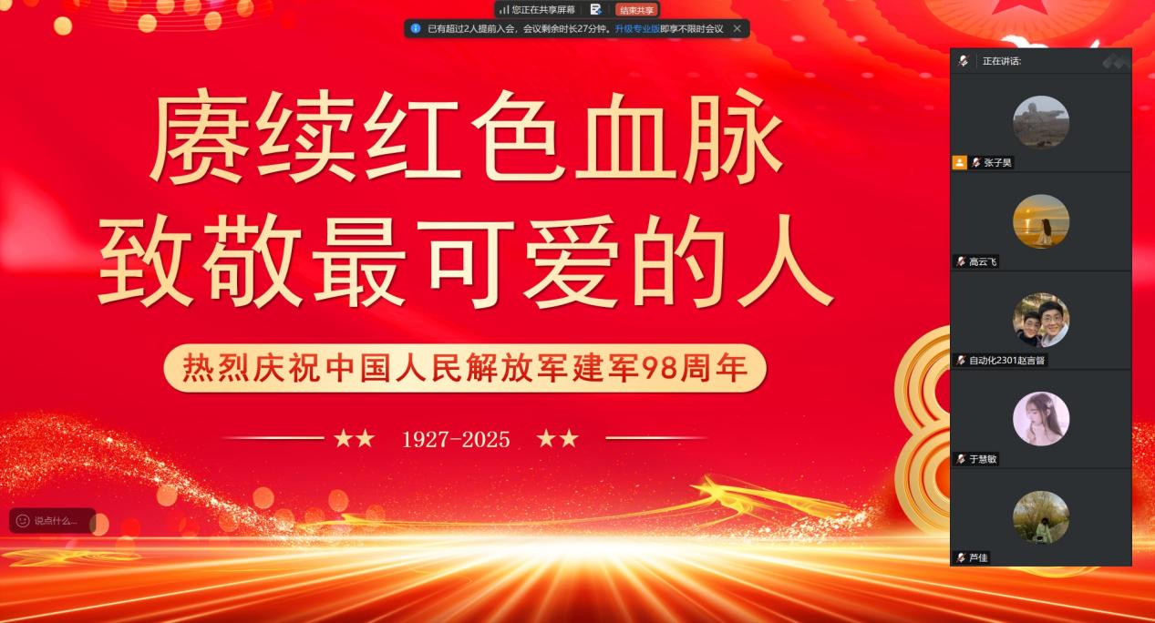 党日活动负责人首先带领全体成员回顾中国人民解放军98年的光辉历程,重温革命先辈在战争年代浴血奋战、为国家和民族解放事业牺牲奉献的英雄事迹,引导党员们深刻感悟红色血脉的内涵,增强对革命历史的认同感与敬畏心,推动红色基因代代相传。在集中学习之后,党总支成员共同学习了英雄先烈的事迹故事,如赵一曼,狼牙山五壮士等英雄先烈的故事,以及陈祥玉,王焯冉等当代中国军人的英勇事迹,让支部成员们深受触动,大家纷纷表示要向“最可爱的人”学习,不忘初心、牢记使命。活动最后,赵春江老师对本次党日活动进行总结发言,他呼吁青年党员要在缅怀先烈中汲取奋进力量,在致敬军人中强化使命担当,要意志坚定,忠诚守信,荣辱不惊,纪律严明。
