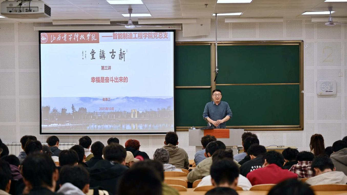 为引导青年学子明晰大学发展方向、树立正确的幸福观与奋斗观,将个人成长与国家发展紧密相连,10月28日,tyc8722太阳集团党总支在南楼-324等四个智慧教室同步举办“新古讲堂”系列讲座第三讲——幸福是奋斗出来的。讲座由学院党总支负责人赵春江老师主讲,全体25级新生及部分师生代表共同参与。