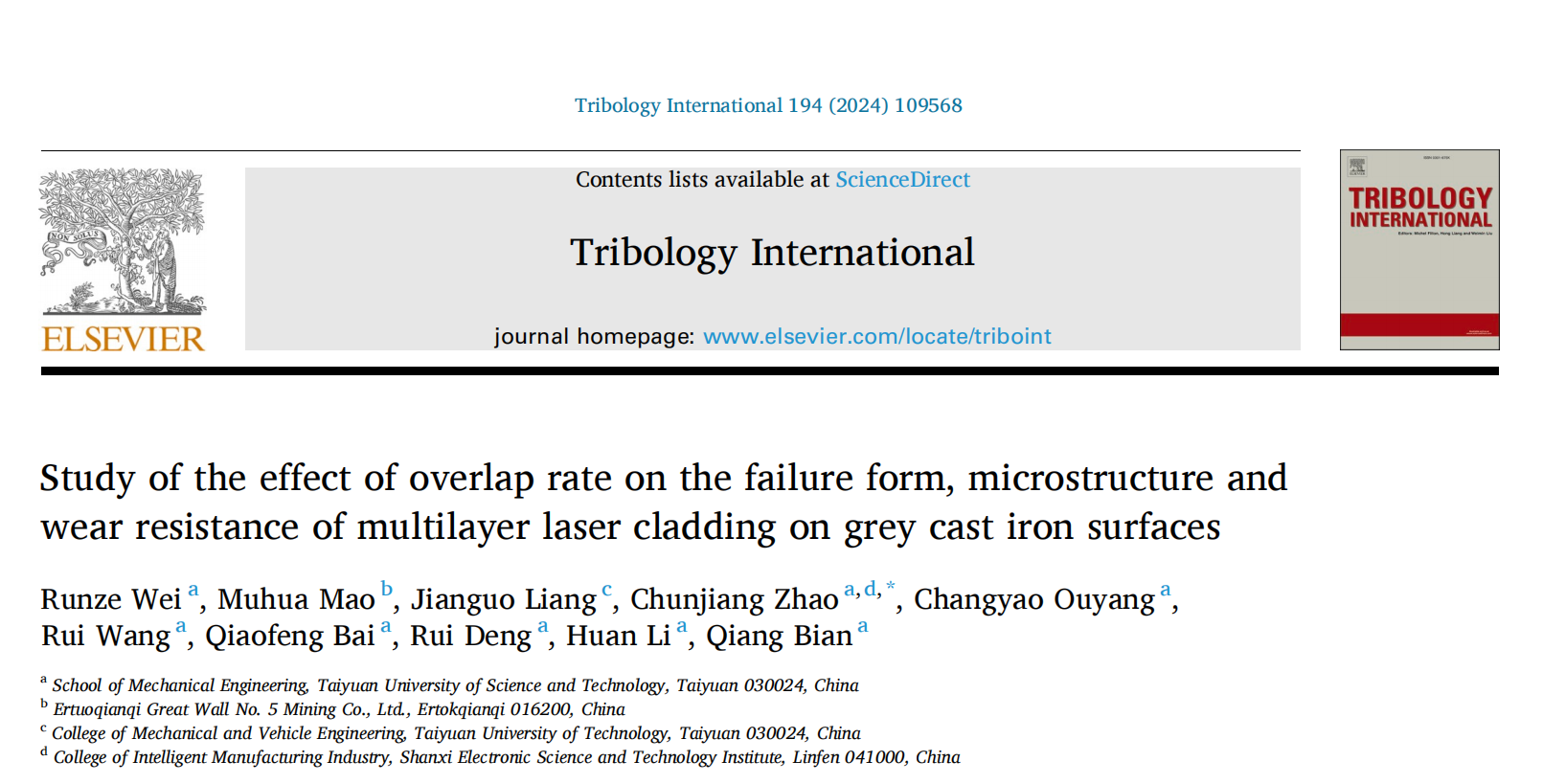 近日,我院作为合作单位,与太原科技大学和太原理工大学合作的论文《Study of the effect of overlap rate on the failure form, microstructure and wear resistance of multilayer laser cladding on grey cast iron surfaces》,发表在摩擦学领域国际顶级期刊《Tribology International》(注:1区Top,影响因子6.2),并受到“激光制造研究”公众号推荐。