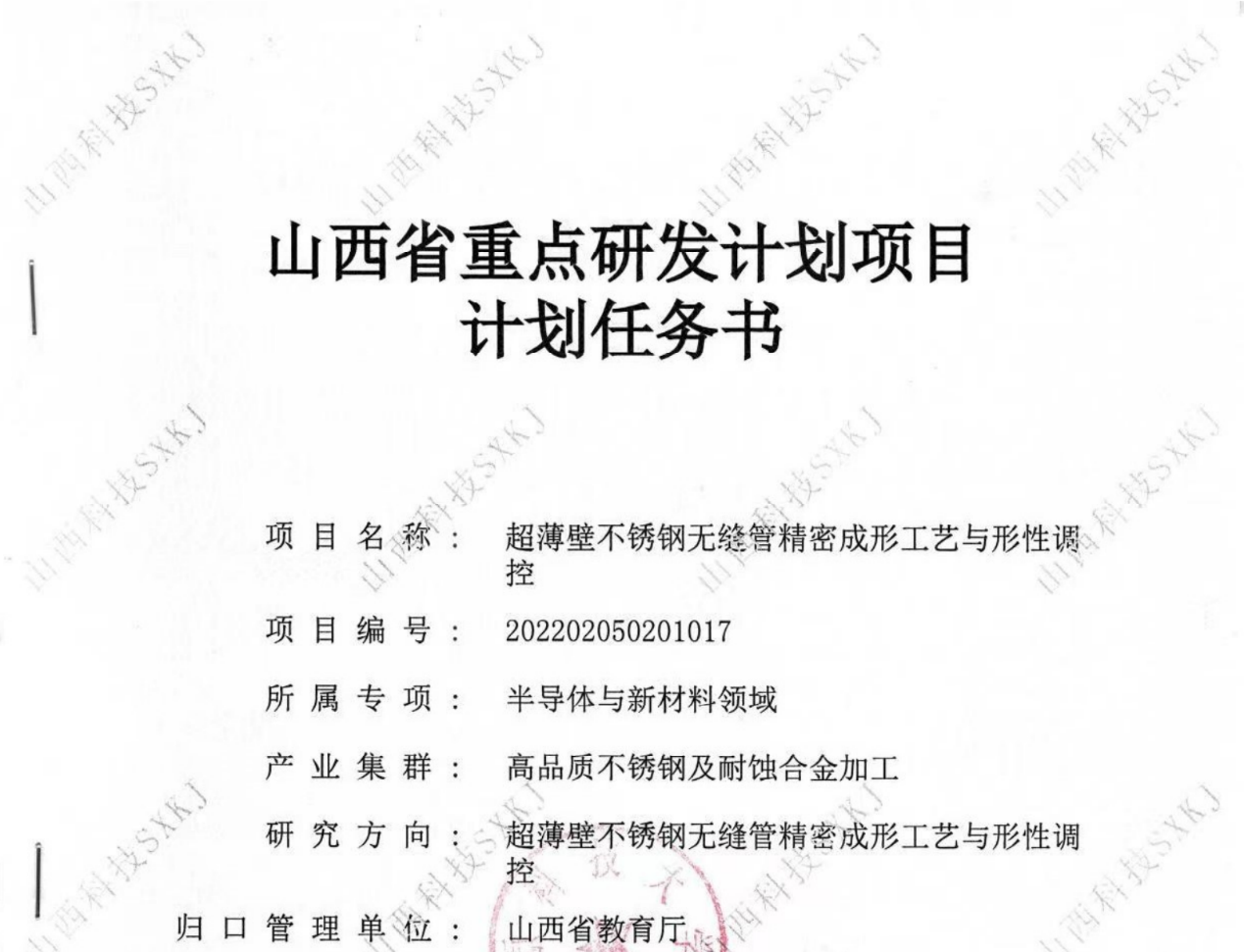 我院教师申报的山西省重点研发计划项目获批。项目拟基于“高剪切应力大应变环辊旋轧破晶和薄壁化大延伸+高速滚珠旋压超薄壁化”组合加工为总体工艺路线设置研究内容,以超薄壁管变形区平面压缩剪切应力状态、金属流动特性、工艺参数对组织性能和成形稳定性的影响规律,基于超细晶增塑效应和马氏体相变的应力状态依赖性机制,超薄壁管无退火低碳旋轧及终轧热处理工艺及超细晶无缝管马氏体逆相变机制,大长径比超薄壁不锈钢无缝管旋轧工艺装备成套开发和连续旋轧管件尺寸精度保障系统等四部分具体研究内容。