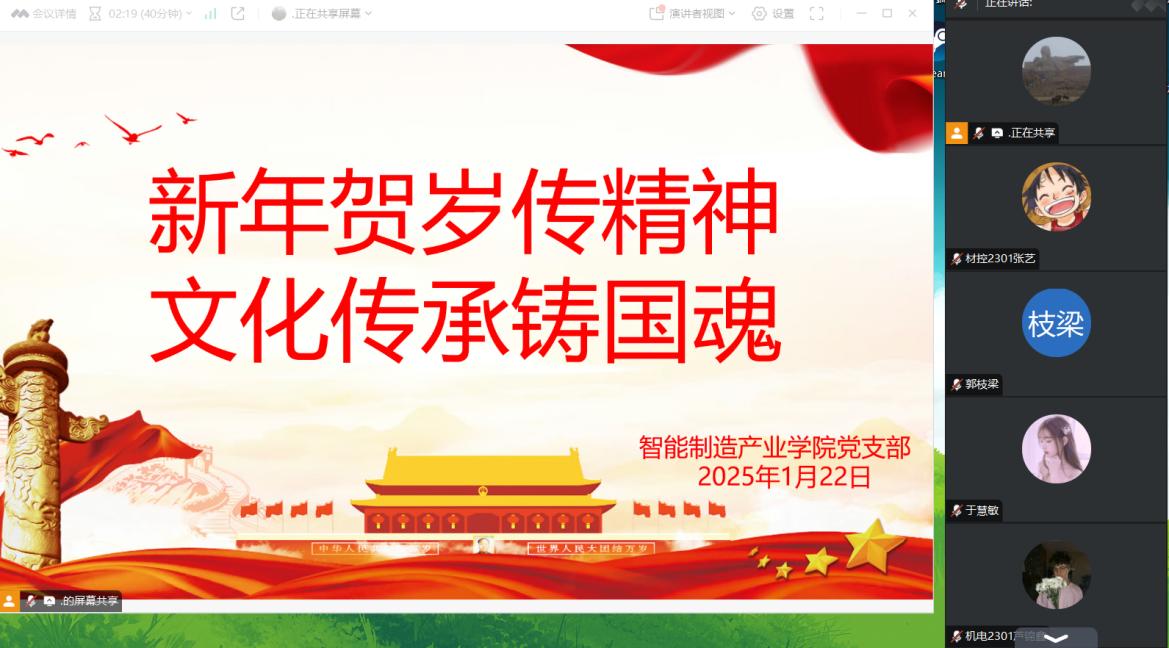 为深入学习习近平总书记二〇二五年新年贺词中的重要指示精神,激励党员们在新的一年汲取奋进力量,让支部成员进一步理解春节等传统节日蕴含的文化价值与精神内涵。1月22日,智能制造产业学院党支部组织开展了“新年贺岁传精神,文化传承铸国魂”主题党日活动。