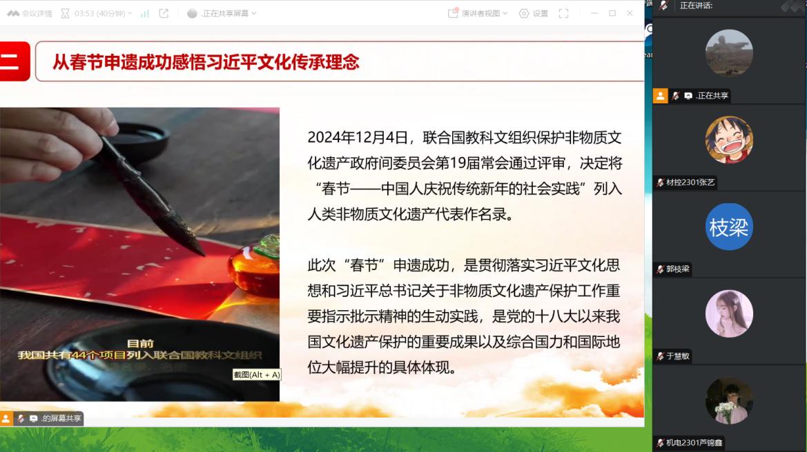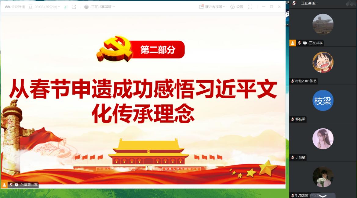 于慧敏同志首先带领同志们深入学习国家主席习近平二〇二五年新年贺词重要讲话,大家逐字逐句学习领会贺词内涵,贺词总结了过去一年里党和国家所取得的成就,回顾了那些激动人心的精彩瞬间,为学生党员带来了强大的精神鼓舞与动力。接着党日活动负责人组织支部成员从春节申遗成功感悟习近平文化思想传承理念,学习传统文化节日,感受中华文化的博大精深,旨在让党员同志们带头弘扬民俗文化,传递民族精神,营造文化氛围,将传统文化中的优秀品质与党性教育结合。最后韩丽娟老师对本次活动进行总结,鼓励全体党员同志在新的一年,以新年贺词为动力,提升站位勇担当、求真务实谋发展,以饱满的精神状态、务实的工作作风投入到2025年的学习、工作与生活之中。